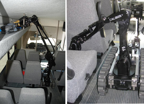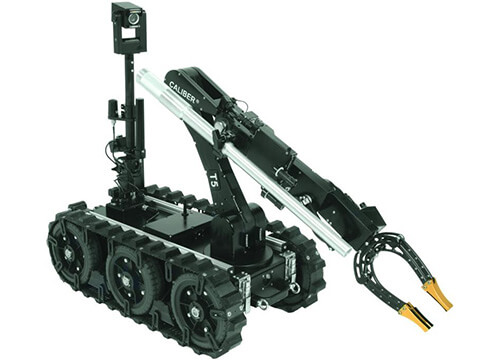 ●機動性:T5 機器人寬度僅為 44cm,特別適合排爆及特警在狹小空間內進行排爆工作。重量只有 64kg,可以放在車輛后備箱中運輸。加長臂伸展長度為 267cm,可抓取機艙或車廂行李架上的任何可疑物。●武器系統:T5 機器人配有單路水泡槍底座,可以與目前世界絕大多數無后座力水泡槍配合使用。同時,也可加載 Benelli M4 散彈槍。配有兩組激光瞄準器,通過CCU 單元操控的四路獨立的開火裝置。同時,可裝配便攜式 X 光機。