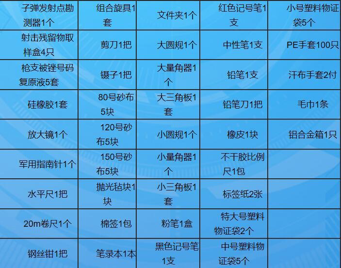 配備槍支被銼恢復器具、槍擊點勘查器、彈道分析軟件、槍械識別叢書、現場測量器具、物證收集標準化包裝器具、現場記錄用具,主要配置:槍彈發射擊點勘查器、槍械槍彈識別全書(三本)、槍支被銼號碼復原液(附配方)、彈道分析軟件、放大鏡、鋼絲鉗、醫用剪刀、大鑷子、組合旋具、15米布卷尺、大分規、粉筆、圓珠筆、鉛筆、記號筆、不干膠比例尺、物證標簽、物證袋、毛巾、手套、筆記本、水平尺、量角器、三角尺、鋁合金手提箱。外形尺寸(長寬高):58×35×14.5CM