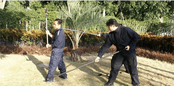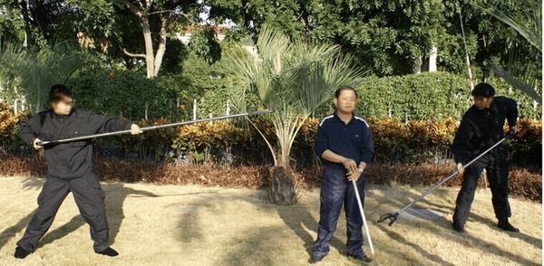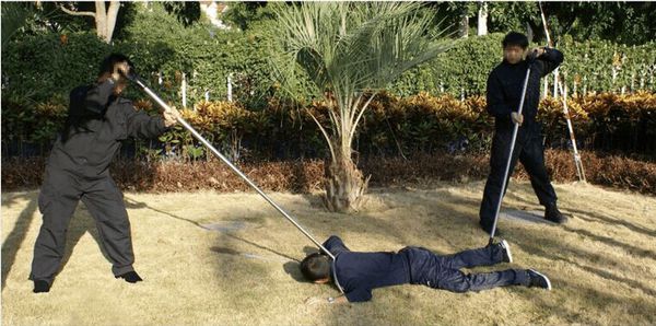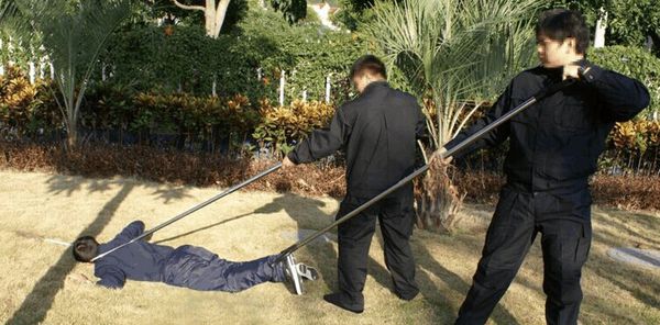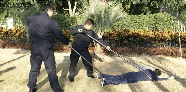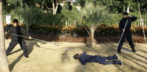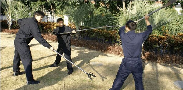 持抓捕器隊員首先破壞歹徒重心,持鋼叉隊員趁勢用鋼叉將歹徒推到,兩人合力將歹徒控制