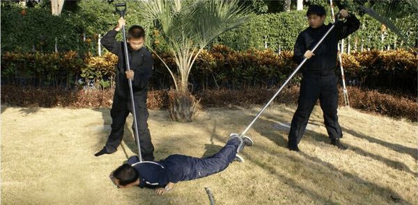 持多功能抓捕器隊員用力向后拉動抓捕器,使歹徒失去重心,同時持鋼叉隊員向前猛推歹徒上身,兩人合力將歹徒制服。